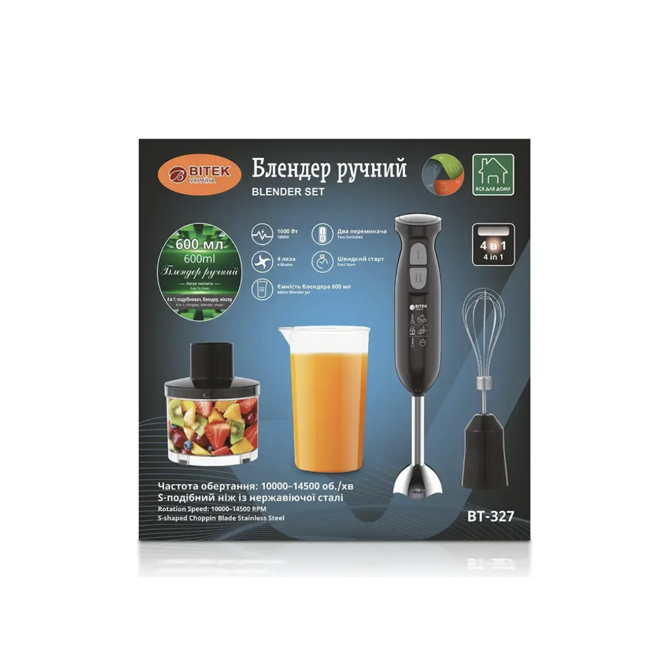 Опис Блендер ручний 4 в 1 600мл 1600Вт BITEK BT-327/ 6655 (12)