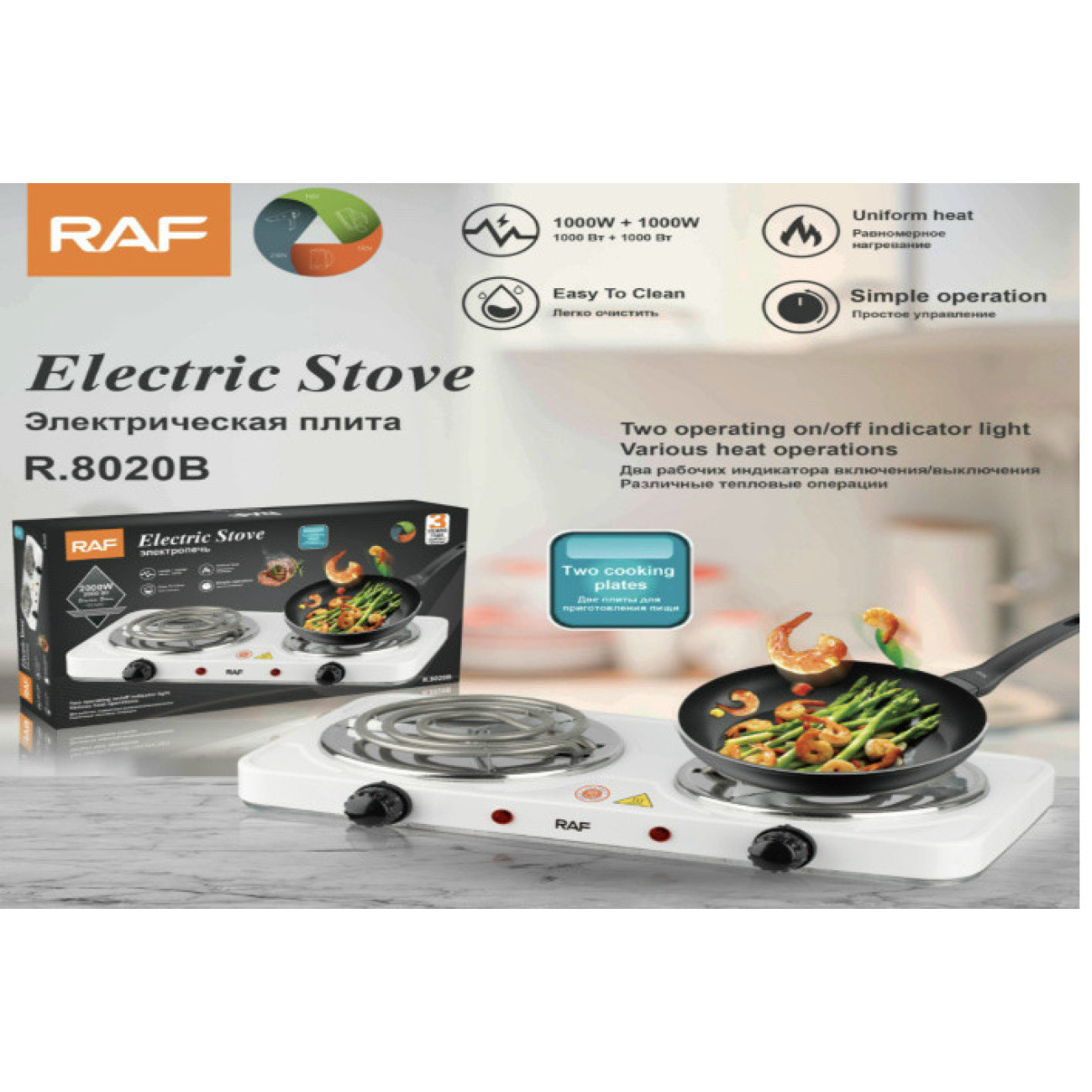 Двоконфоркова електрична кухонна плита RAF-8020B зі спіральним нагрівальним елементом з високоякісної сталі має перевагу мобільності завдяки компактним розмірам, її зручно транспортувати та встановлення не потребує особливих навичок, оскільки її функціонування залежить виключно від наявності електричної мережі. Регулювання відбувається за допомогою механічного перемикача.