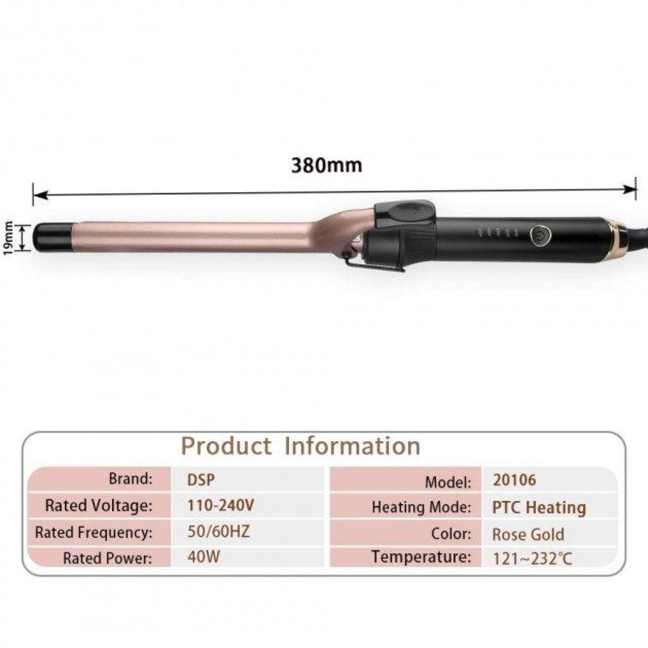 Основні характеристики Плойка для завивання волосся DSP 20106, для створення локонів, кераміка, 19 мм (24 шт./ящи)