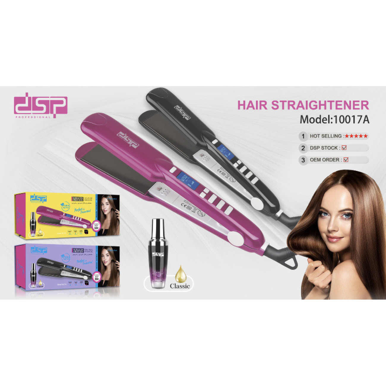 Праска DSP — 10017 обладнана регульованим температурним контролем до 400 o C. На корпусі розташовані кнопки healthy — для здорового волосся, damaged — для пошкоджених, увімкнення/вимкнення, блокування і збільшення/зменшення температури.