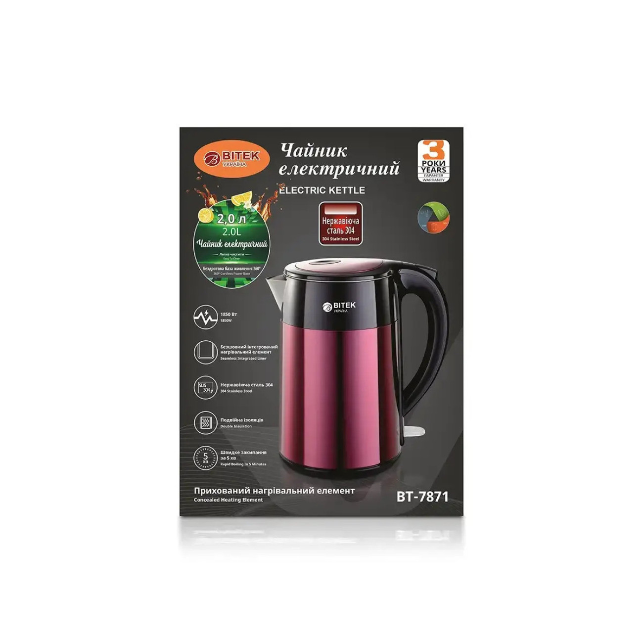 Опис Чайник електричний 2,0л 1850Вт BITEK BT-7871/ 6777 (12)