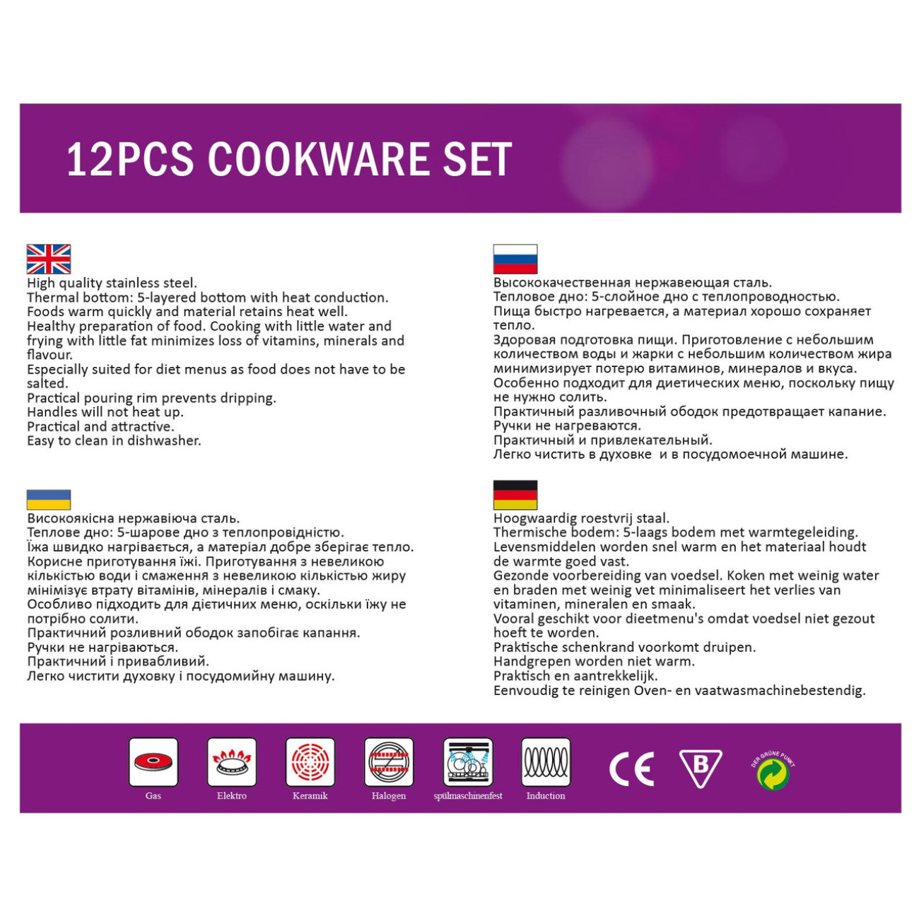 Основні характеристики Набір каструль 12 пр Нерж 1 л; 2,1л; 2,9л; 3,9л; 5,1л; 6,5 л BN 296 (2 шт./яск)
