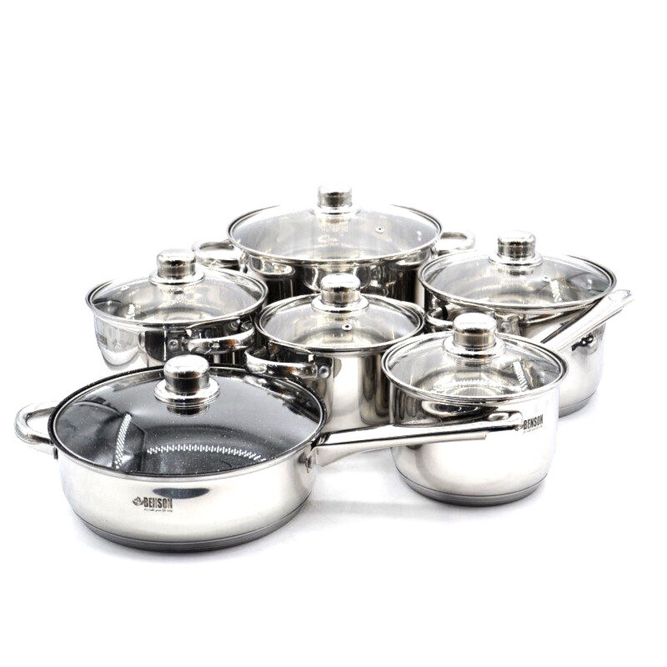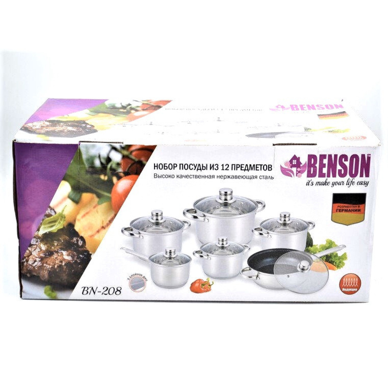 Основні характеристики Набір каструль 12 пр Нерж 2,1л; 2,1л; 2,9л; 3,9л; 6,5 л +сковорода 24 см BN-208 (2 шт./яск.)