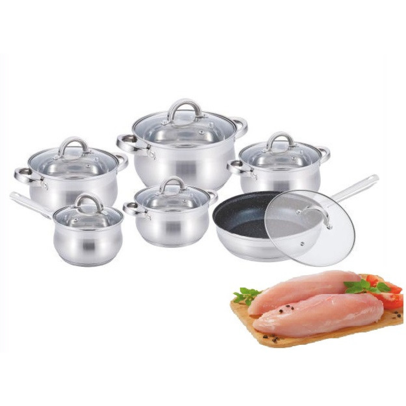 Основні характеристики Набір каструль 12 пр. Нерж 2,1л; 2,1л; 2,9л; 3,9л; 6,5 л +сковорода 24 см BN 212 (2 шт./яск.)