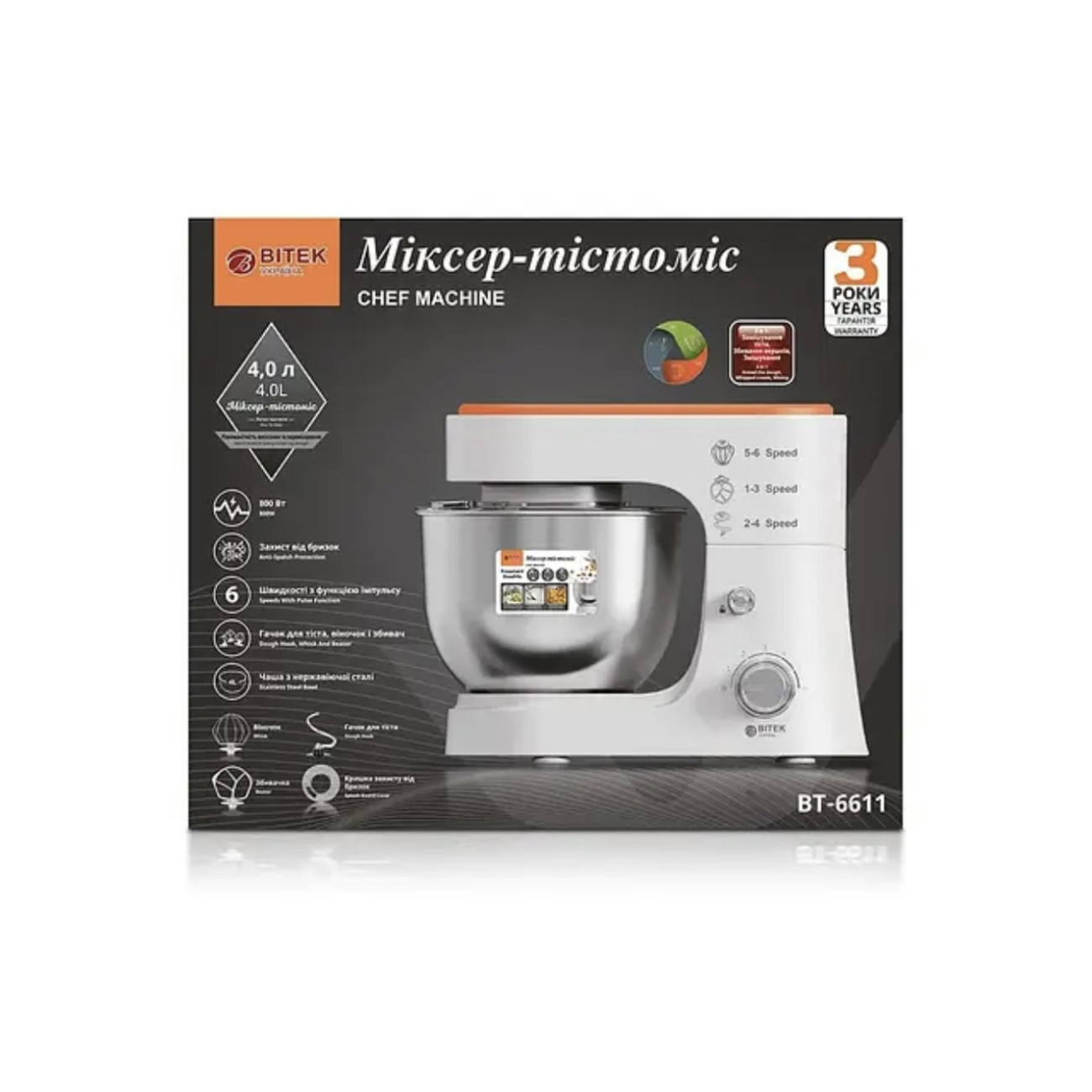 Опис Мiксер-тiстомiс стацiонариний 800BT 4л планетарне обертання металева чаша BITEK BT-6611 7019 (4 шт)