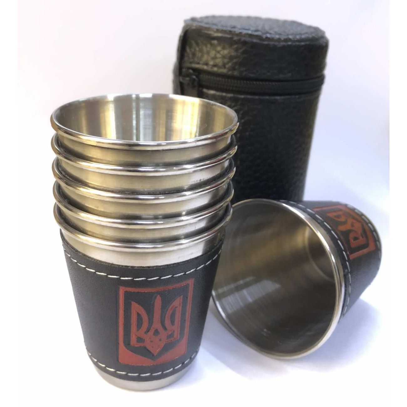 Відгуки про Стопки 6 штук у наборі обтягнуті шкірою в чохлі 80 мл Герб Тризуб UKRAINE (200)
